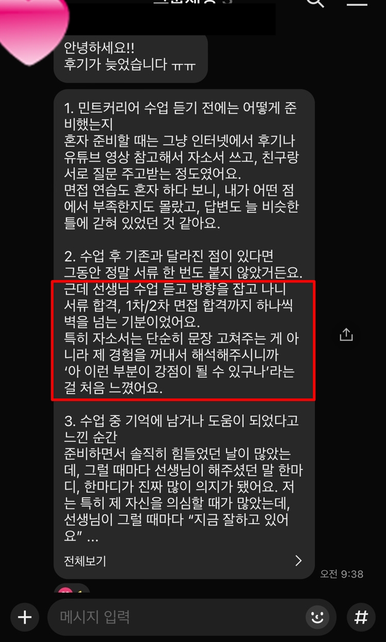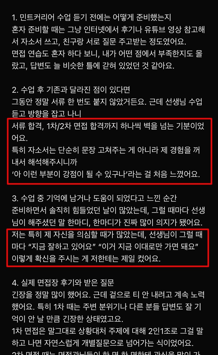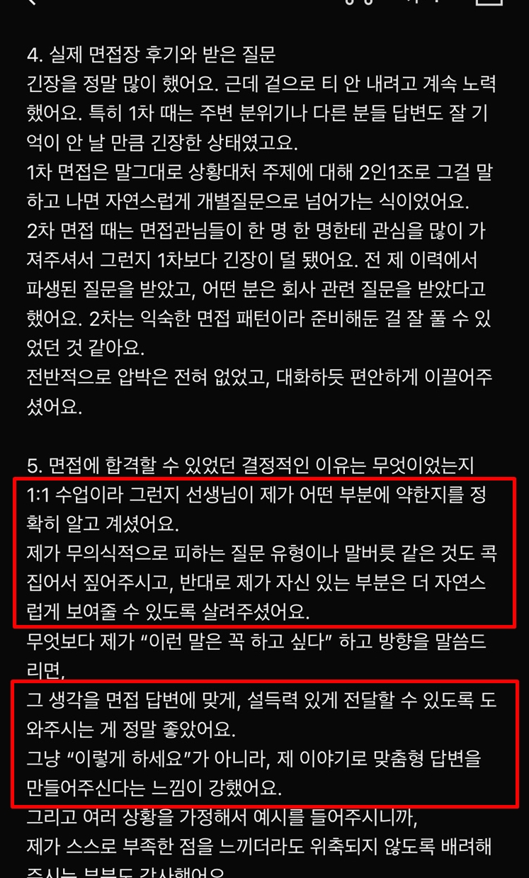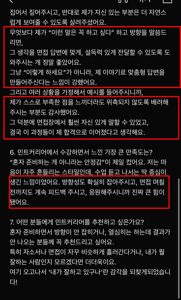 그 생각을 면접 답변에 맞게, 설득력 있게 전달할 수 있도록 도와주시는 게 정말 좋았어요.