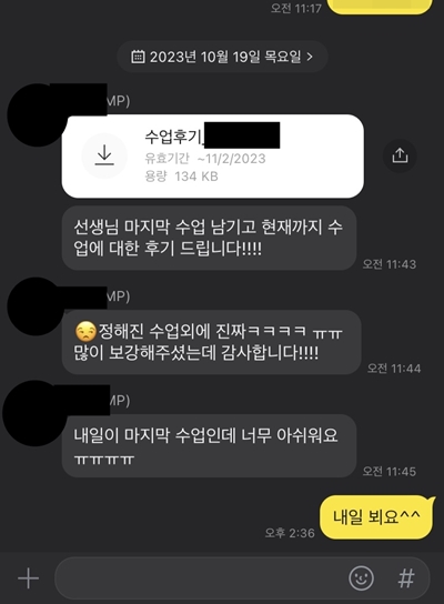 그래도 마지막 수업 때까지 부족한 부분 없는지 계속해서 체크해 주시고 뭐라도 챙겨주시려고 하시는데 너무 감사했어요.